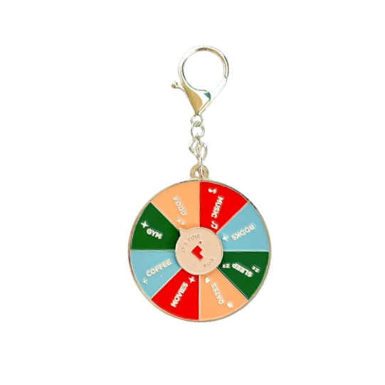 Add a playful touch to your bag with our BagMates spinner keychain. Featuring a fun, interactive design, the middle piece spins to help you decide what to do today - whether it's reading a book, enjoying music, catching up on sleep, hitting the gym, or grabbing a coffee. This unique keychain not only adds personality to your bag but also serves as a quirky way to bring spontaneity to your daily routine.