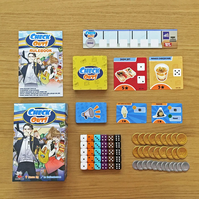 Check Out! is a 2 to 6 player dice chucking, fast grabbing, family tabletop game where you rush to your favourite convenience store to grab your favourite snacks.