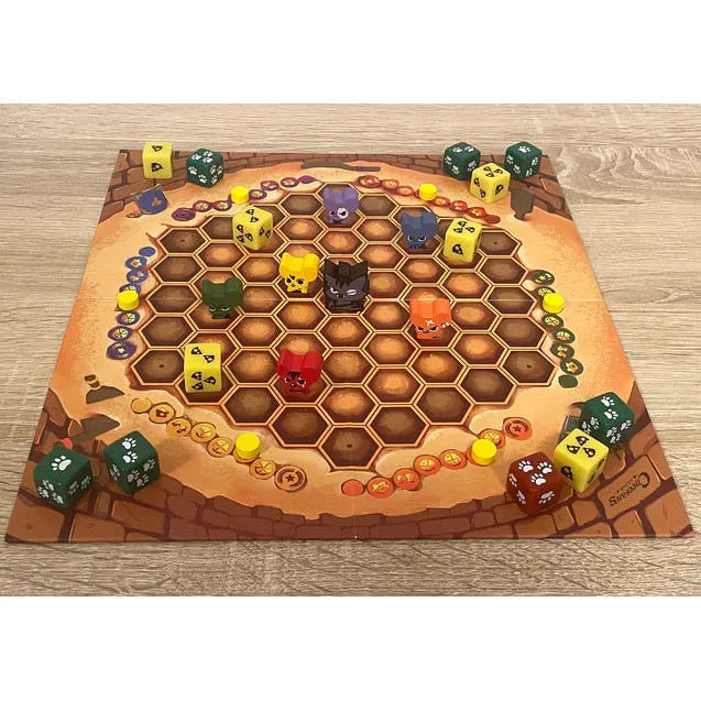 Take turns to draw from a common pool of dice to move your mouse, or the cat, or to distribute cheese over the game arena.