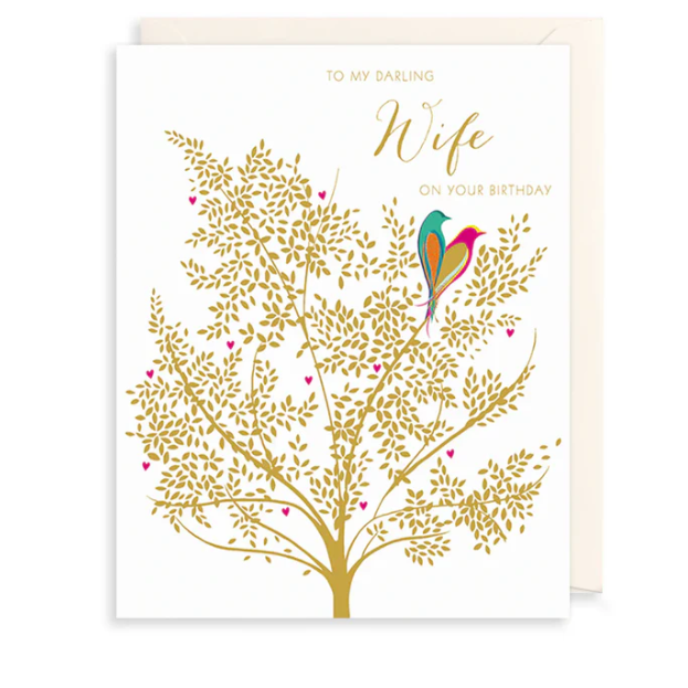 Say happy birthday to your wife with this beautiful card. This colourful card features two birds in a golden tree reads 'To my darling wife on your birthday'.