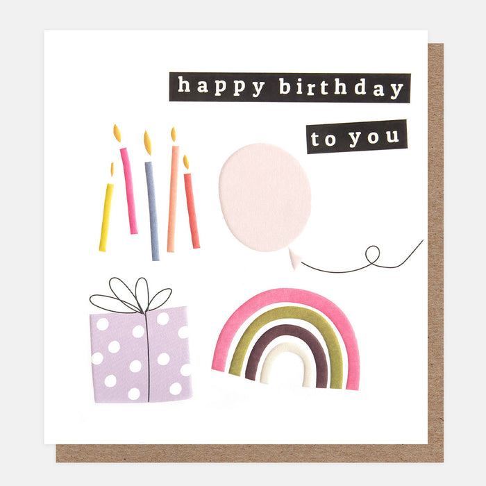 Part of Caroline Gardner's Dynamo range this beautiful 'happy birthday to you' card features a colourful rainbow, candles, balloon & present, and is finished with embossed detail for that extra special touch.