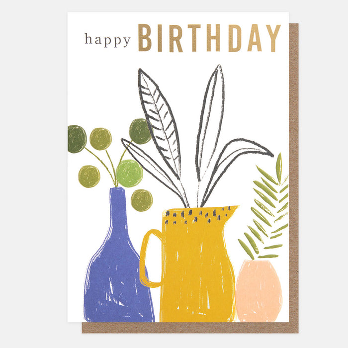 Part of Caroline Gardner's Sketchbook range this pretty plants in vases 'happy birthday' card is finished with gold foil and embossed detail for that extra special touch.