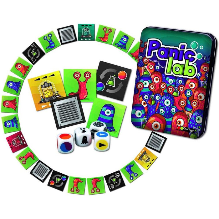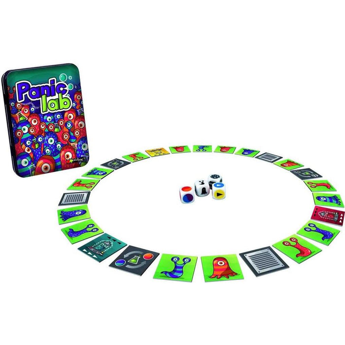 In Panic Lab, the player-scientists have their hands full trying to figure out which amoeba to catch and where it might have oozed off to. To set up the game, shuffle the 25 cards, then lay them out in a circle.