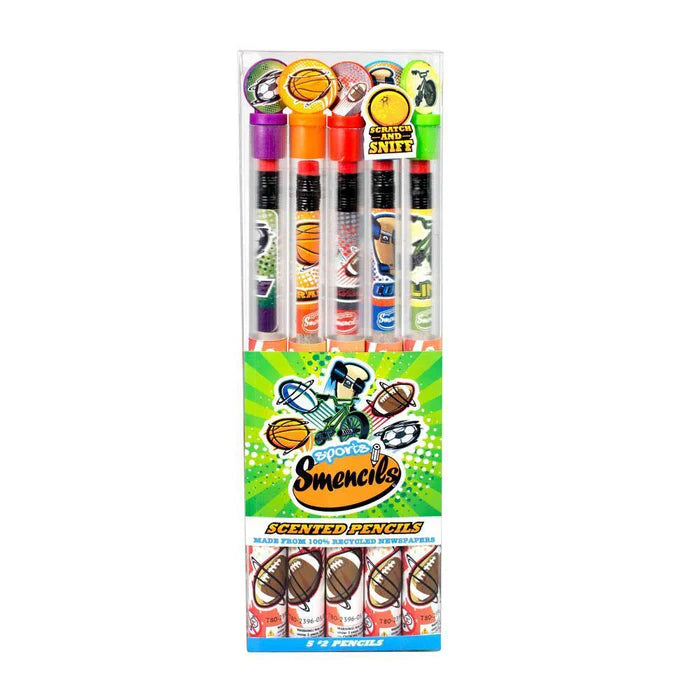 The Sports Smencils® 5-Pack includes 5 of our gourmet scented pencils that are made from 100% recycled newspapers. Each Sports Smencil® is a No.2 graphite pencil and is packaged in its own recyclable plastic freshness tube that includes a collectible character top cap! You will receive one each of the 5 scents.
